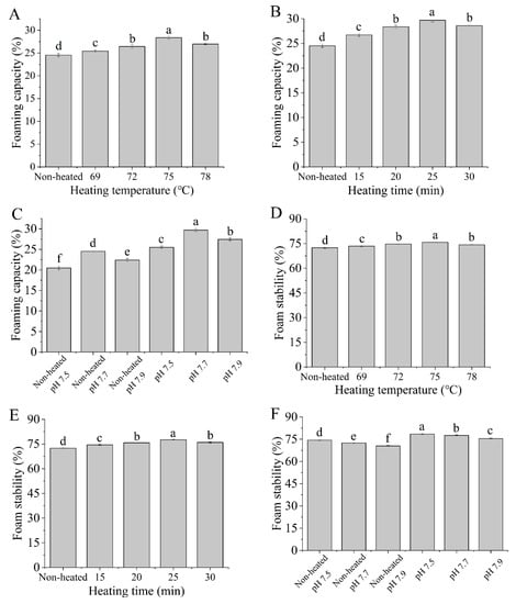 Heat−induced changes in the foaming capacity and foam stability of goat milk whey protein ((A,D) heating temperature, (B,E) heating time, (C,F) pH). Different letters are significantly different (p < 0.05). Error bars represent the standard deviation of the means.
