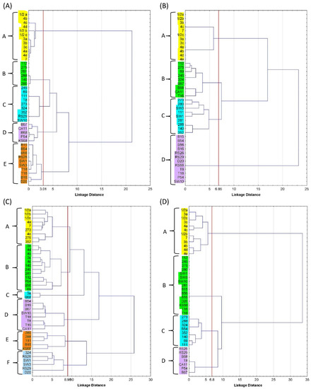 Dendrogram of reference LMs and atypical LMs, grouped by (A) selected morphological and biochemical characteristics, (B) ability to ferment sugars, (C) antibiotic resistance, and (D) presence of virulence genes. Groups of isolates highlighted in different colours on the dendrograms are indicated by the letters A–F.