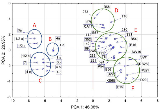 PCA analysis divided the references and isolates into two separate oval clusters that align along the vertical axis with a weak slope to the horizontal axis, the slope being for aLM rather than LM (Figure 3). The first two principal components (PCs) accounted for 75.33% of the total variance. The apparent separate alignment of the LM and aLM strains was probably caused mainly by differences in virulence genes and in morphological and biochemical traits (Figure 1A,D), and to a lesser extent by differences in sugar fermentability and antibiotic sensitivity (Figure 1B,C). The group of standards spanned 4.77 units, while the group of isolates spanned 8.15 units (Figure 3), confirming that the group of isolates has more diverse biochemical and genetic characteristics than the group of reference strains. The standards formed three groups (A, B, and C) corresponding to the phylogenetic groups, with the exception of strains 3a and ½b. The isolates also formed three groups (D, E, and F), of which D contained five isolates from strawberry T16, beetroot B68, carrot CA11, and from cattle intensive-grazing meadows (273 and 275). Group E had the largest, with as many as 17 isolates from soil (9 isolates), vegetables (5 isolates), fruit (2 isolates), and swabs (1 isolate). Group F contained eight isolates from kale (KS 68) and radish sprouts (RS 26 and RS29), beetroot (B15 and B56), meat dumplings (D20), and lineage swabs (SW1 and SW3). The analysis showed that reference strains 4a and 4c were most similar to aLM isolates from group E, especially to isolate 69. Among the aLM isolates, isolates 273 and B68 were the most distantly related to B15, RS29, and D20, mainly based on the CAMP test.