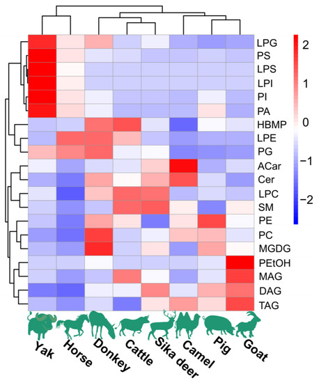 The content of major lipids in spinal cords of different species of domesticated animals. Each colored cell on the map corresponds to a peak area value of different lipid species. Red indicates high, and blue indicates low.