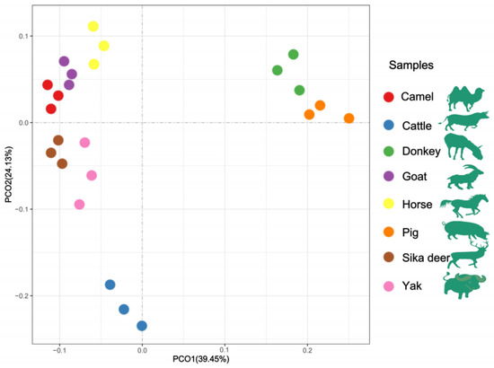 PCoA analysis of lipid molecules among the eight domesticated animals.