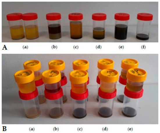 (A) Extracted oils with seedcake sediments and (B) separated oils and sediments from (a) sesame; (b) pumpkin; (c) flax; (d) milk thistle; (e) hemp and (f) cumin.