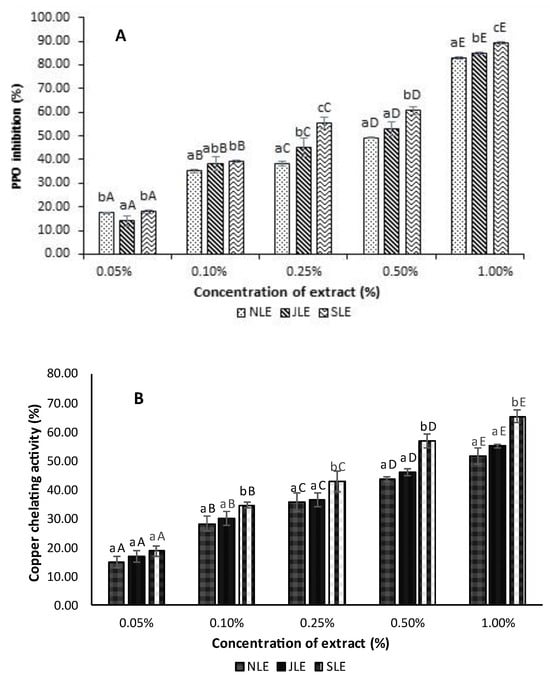 The PPO inhibitory activity (A) and copper-chelating activity (B) of dechlorophyllized ethanolic extracts from three Thai indigenous leaves. Bars represent the standard deviation (n = 3). Different lowercase letters on the bars within the same concentration indicate significant differences (p < 0.05). Different uppercase letters on the bars within the same leaf extract indicate significant differences (p < 0.05).