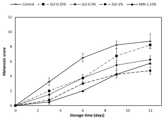 At day 0, the melanosis scores of all the treated samples and the control were approximately zero. The melanosis score rose with a longer storage time, particularly in the control, which had the highest score, compared to the treated samples (p < 0.05). Lower melanosis scores were recorded in samples treated with higher concentrations of the extract and those treated with SMS. The SMS-1.25% sample showed the lowest melanosis scores within the first 6 days of refrigerated storage (p < 0.05). As the storage time exceeded 9 days, the SLE-1% sample showed the lowest melanosis score (p < 0.05). The sharp upsurge in the melanosis score of the SMS-1.25% sample might be due to the instability of the sulfite compound as a result of the formation of sulfur dioxide, which reduced its potency in melanosis inhibition as the storage time progressed [46]. SMS can retard melanosis through the nucleophilic attack of sulfite at ο-quinone and by hydrogen addition, thereby reducing quinone in the reaction [47]. White shrimps were treated with catechin and its derivatives at various concentrations (0.25–0.75%) and stored at 4 °C for 10 days [32]. The SLE-1% sample exhibited the lowest melanosis score on day 12 of storage (p < 0.05). This was consistent with the highest PPO-IA and CCA of SLE, as presented in Figure 1A,B. The observed effect might be associated with high levels of phenolic compounds such as catechin, epicatechin, ferulic acids, rutin, etc., which were reported to inhibit melanosis in previous studies [41,48]. SLE could therefore inhibit melanosis in raw Pacific white shrimp during refrigerated storage at 4 °C. After 12 days of storage, the lowest melanosis was detected for the SLE-1% sample, whereas the control had the highest melanosis (Figure 3).