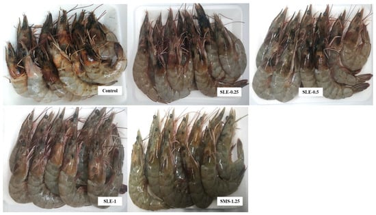 Freshly caught Pacific white shrimps (55–60 shrimps/kg) purchased from a local market in Hat Yai, Thailand, and kept in a polystyrene box with flaked ice (shrimp/ice ratio of 1:2 (w/w)) were transported to the laboratory within 30 min. After washing using tap water and draining on the screen for 3 min, whole shrimps were immersed into the SLE solutions at varying levels (0.05, 0.1, 0.25, 0.5, and 1%) using a solution/shrimp ratio of 2:1 (v/w) and then kept at 4 °C for 30 min. Another group of whole shrimps was treated with a 1.25% SMS solution and kept under the same conditions. The control group was prepared in the same way by immersing the shrimp in distilled water and kept at the same temperature and time. After the treatments, the samples were drained using a stainless-steel screen, transferred to polystyrene trays, wrapped with shrinkable plastic film, and kept at a refrigerated temperature (5 ± 1 °C). The samples were randomly taken for analysis at 3-day intervals for 12 days.
