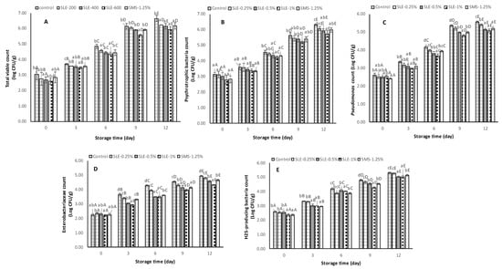 The microbiological quality of samples treated with SLE (0.25–1%) and SMS (1.25%) and the control, stored at 4 °C for 12 days, was monitored (Figure 4).