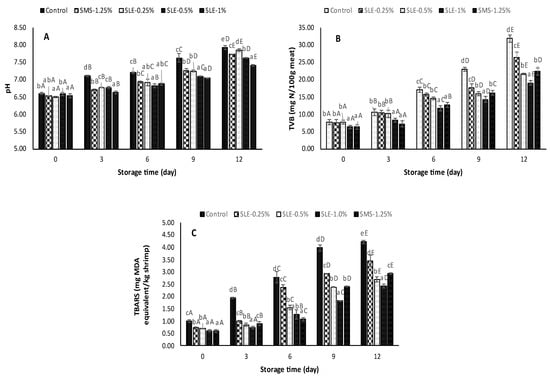 The pH (A), total volatile base (TVB) compounds (B), and thiobarbituric acid reactive substances (TBARS) (C) of Pacific white shrimp treated with dechlorophyllized ethanolic soursop leaf extract (SLE) at different concentrations during 12 days of refrigerated storage. Bars represent the standard deviation (n = 3). Different lowercase letters on the bars within the same storage time indicate significant differences (p < 0.05). Different uppercase letters on the bars within the same treatment indicate significant differences (p < 0.05). SLE-0.25%, SLE-0.5%, and SLE-1% represent Pacific white shrimp treated with SLE at 0.25, 0.5, and 1%, respectively. Control and SMS-1.25% represent Pacific white shrimp treated with distilled water and 1.25% sodium metabisulfite, respectively.