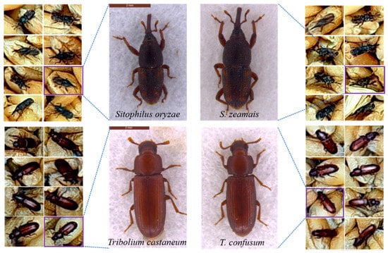 - Yang, H.Y.; Zhao, H.Y.; Zhang, D.F.; Cao, Y.; Teng, S.W.; Pang, S.N.; Zhou, X.G.; Li, Y.Y. Auto-identification of two Sitophilus sibling species on stored wheat using deep convolutional neural network. Pest Manag. Sci. 2022, 78, 1925–1937. [Google Scholar] [CrossRef] [PubMed]