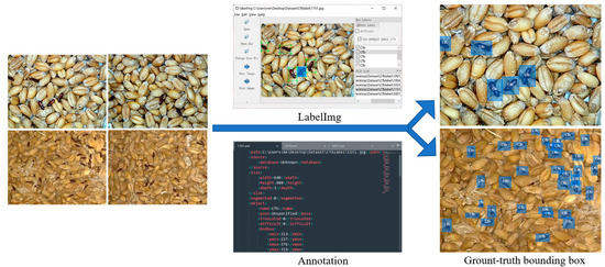 After obtaining the dataset of images depicting pest activity in stored grains, we used the labelImg software to manually annotate and label each pest in the images, generating corresponding *.xml files for individual pest photos. These manually annotated bounding boxes in the training, validation, and test sets precisely defined the true boundaries of objects in the images. As shown in Figure 2, this process involved associating each object with (x,y) coordinates representing the bounding box and class labels. Our primary objective was to leverage these class labels and bounding boxes for the construction of an object detection model, subsequently evaluating its performance on both the validation and test sets. Samples with blurred images caused by the rapid crawling of individual pests during their damaging activities in stored grains and those where over 50% of the pest’s head, pronotum, or elytra was obstructed, were labeled as “DIFFICULT” or left unlabeled and were not included in the model training. In total, 26,806 individual pest activity postures were annotated for training and testing, encompassing various damaging postures pests exhibit in stored grains. In the laboratory segment, there were 894 T. confusum and 880 T. castaneum individual samples, while in the field, there were 9894 individual samples of T. confusum and 15,138 individual samples of T. castaneum. This diverse range of pest damaging postures contributes to training a model with a broader understanding of pest behaviors and characteristics.