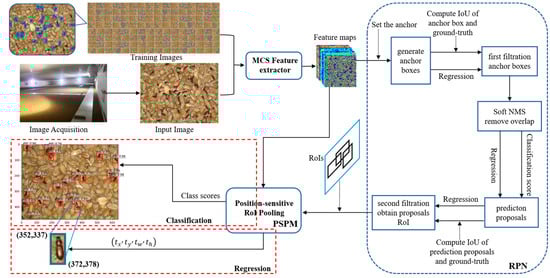 In this study, we introduce a novel framework built on Faster R-CNN that provides superior accuracy for stored-grain insect detection. Extensive comparative experiments on popular bases, including VGG16, ResNet50, ResNet101 [], and MCS [], were conducted to achieve high-efficiency detection accuracy. We further propose several effective techniques to improve the new species dataset’s performance, such as adjusting the anchors’ locations and sizes and using a Position-Sensitive Prediction Model (PSPM) in lieu of fully connected layers.