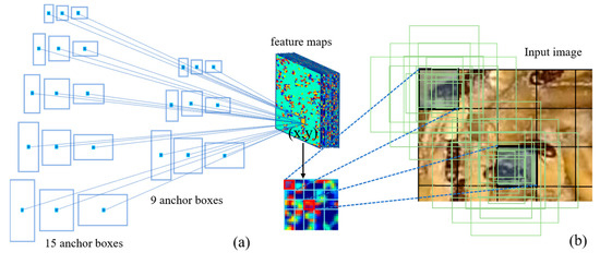 Object detection relies significantly on the use of anchor boxes to enhance the speed and efficiency of sliding window-based detection. Anchor boxes represent a predefined set of bounding boxes with dimensions tailored to match those of objects within the dataset. These recommended anchor boxes encompass diverse combinations of object sizes that naturally occur in the dataset, incorporating variations in aspect ratios and scales. The quantity of anchor boxes proposed for utilization at different spatial locations within an image is denoted as ‘k’. In our approach, we employed three distinct scales, with anchor box areas of 82, 162, and 322, coupled with aspect ratios of 1:1, 1:2, and 2:1. As a result, for the VGG16, ResNet, and MCSNet models, each (x, y) coordinate position is associated with k = 9 anchor boxes, as illustrated in Figure 5. In the case of MCSNet Plus, the scales were reconfigured while preserving the same three aspects. Given convolutional feature maps of size W × H (typically around 2400), this results in a total of W × H × k anchor boxes.