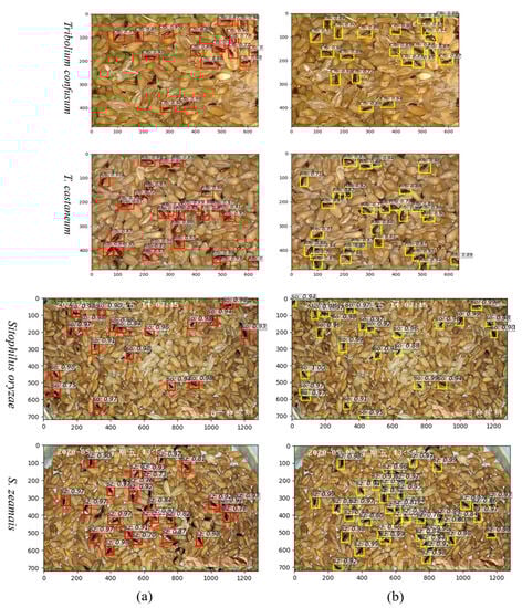 The mAP values for the Tribolium testing outperform those for the Sitophilus testing by 0.35–2.47%, reaching a maximum of 96.83 ± 0.43% (Table 3). Additionally, the Tribolium demonstrates faster prediction speeds compared to the Sitophilus. Furthermore, when comparing the three datasets, it can be observed that the mAP values for all four species based on the laboratory dataset are higher than those based on the real storage dataset, with faster testing speeds. This suggests that image resolution impacts the results of object detection. However, it is worth noting that the differences among the three datasets of Sitophilus are not significant, which may indicate that increasing the sample size can enhance the precision of detection to some extent.