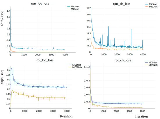 The classification loss and regression loss curves of MCSNet and MCSNet+ on the training set for the Region Proposal Network (RPN) and Region of Interest (RoI). rpn_cls_loss: Region Proposal Network classification loss, rpn_loc_loss: Region Proposal Network location loss, roi_cls_loss: Region of Interest classification loss, roi_loc_loss: Region of Interest location loss.