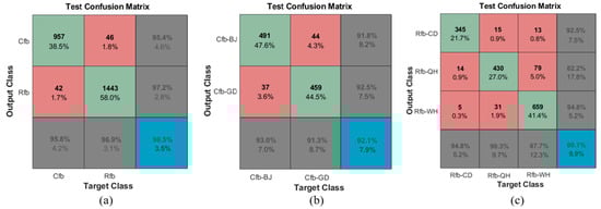 In the realm of predictive analysis, a confusion matrix, often referred to as a confusion table, is a tabular representation with a 2 × 2 structure. It tabulates counts for true positives, false negatives, false positives, and true negatives. This matrix facilitates a more comprehensive analysis that extends beyond mere assessment of correct classification proportions or accuracy. When dealing with an unbalanced dataset—where the numbers of observations across different classes vary greatly—relying on accuracy can lead to misleading results. Figure 10 depicts the percentage of correct classifications for various Tribolium species and geographical strains, presented as a confusion matrix. The species detection performance is robust, with an accuracy rate of 96.5% (Figure 10a). However, the performance decreases when identifying geographical strains of T. confusum and T. castaneum, with respective accuracy rates of 92.1% and 90.1% (Figure 10b,c). For T. castaneum, many Rfb-QH samples are misclassified as Rfb-WH. Nearly 8% of Rfb-CD samples are misclassified as either Rfb-QH or Rfb-WH.