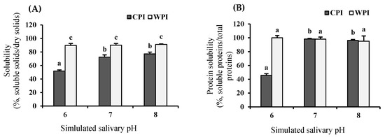 (A) Solubility (%, g soluble solids/g total solids ×100) and (B) Protein solubility (%, g soluble proteins/g total proteins ×100) for CPI and WPI at three pH of simulated salivary fluid (6.0, 7.0, and 8.0) at 37 °C. Data are shown as a mean ± SD (n = 3). Different letters on each bar indicate significant differences (p < 0.05) between pH values for each type of protein.