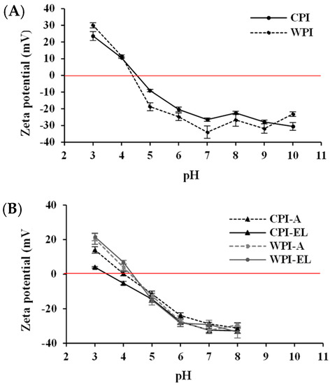 The CPI presented less negative surface charge values (from 23.6 to −30.6 mV) than whey proteins (WPI, from 30.0 to −31.8 mV) in almost the entire pH range studied, except at extreme pH. Accordingly, the CPI produced by isoelectric precipitation may have resulted in samples with lower deprotonation at alkaline pH up to pH 10 and reduced protonation close to and above the pI than the commercial WPI. These results can be explained by the balance of ionic hydrophilic groups and nonpolar hydrophobic amino acid residues that affect the surface charge of chickpea proteins [3,33], suggesting major exposure of nonpolar hydrophobic residues (e.g., aromatic or aliphatic) in a pH range greater than 4 or 10. Zhang et al. (2009) [10] demonstrated that environmental pH significantly affects the secondary structure of chickpea proteins, with more protein–protein interactions being promoted at a higher acid pH.