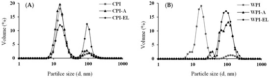 Particle size distribution (d, nm) of protein isolates from (A) CPI and (B) WPI before and after in vitro oral processing (-A: Adult and -EL: Elderly oral conditions) measured at 37 °C. Data represent the mean + SD (n = 30).