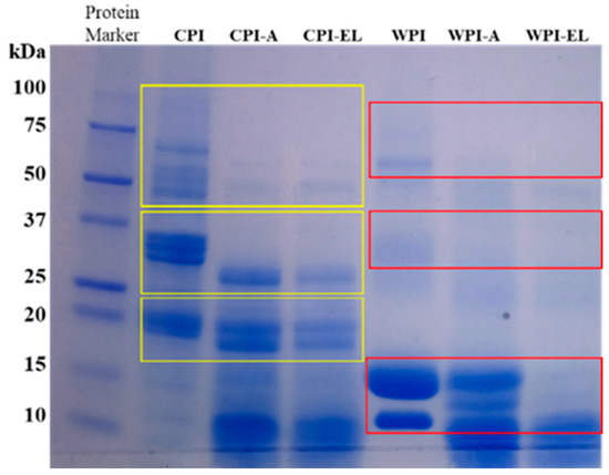 The molecular weight (MW) distribution of the samples was determined by SDS-PAGE gel electrophoresis. All the steps for SDS-PAGE were performed as described previously by Díaz-Calderón et al. (2017) [23] using 4–20% acrylamide gradient precast gels (Bio-Rad Laboratories, Inc., Hercules, CA, USA). The samples were diluted with distilled water to a final concentration of 3 mg protein/mL. Samples (30 µL) were mixed 1:1 with sample buffer and 10 µL of 2-mercaptoethanol. All samples were heated at 100 °C for 5 min before loading. Subsequently, 10 μL of the sample solution was loaded into the electrophoresis lane. Standard molecular weight markers within the 10–250 kDa range were used (KaleidoscopeTM, Precision Plus Protein StandardsTM; Bio-Rad). The electrophoresis was run at 90 V, and the resulting gel was stained with 0.25% Coomassie blue G250.