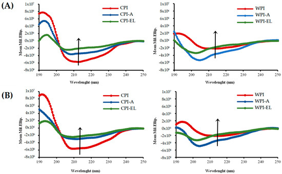The CD spectra of CPI and WPI are shown in Figure 5. In vitro oral processing under elderly conditions altered the protein configuration of both sources. This can be observed by the increase in the unordered or random coil state in the treated samples (CPI < CPI-A < CPI-EL and WPI < WPI-A < WPI-EL) and by the spectra measured at 25 °C (Figure 5A), and 37 °C (Figure 5B). The structural properties of chickpea proteins were more stable than those of whey proteins after in vitro oral processing. The CD spectra of CPI showed a decrease in the area and a shift towards low ellipticity values (according to the arrow in Figure 5A), suggesting an increase in the unordered state of these proteins. A typical CD spectrum showing the tendency of the α-helix secondary structure involves a double minimum at 222 nm and 208 nm, and a strong maximum close to 191 nm. In the present study, CPI (red line) exhibited an α-helical secondary structure, with a maximum at 195 nm (8 × 106, Mil. Ellip.) and two minima at 210 nm and 220 nm, respectively. CPI-A (blue line) exhibited a maximum at 195 nm, but decreased (4 × 106, Mil. Ellip.), and the two minimums tended to disappear, thus, the structural tendency of the α-helix was lost. Finally, CPI-EL (green line) exhibited a maximum at 195 nm, which decreased even further (2 × 106, Mil. Ellip.). The behavior of the minimum is very similar to that of the CPI-A samples. These changes were promoted when the temperature increased to 37 °C, indicating that physiological temperature at the oral level, alkaline salivary pH, and high electrolyte content, such as chloride and potassium, in elderly salivary conditions might favor the unfolding of chickpea proteins.