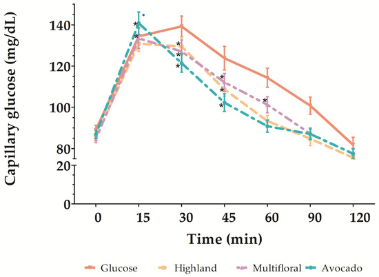 The GI values from highland honey were 69.20 ± 4.07; from multifloral honey, 75.24 ± 5.98; and from avocado honey, 66.36 ± 5.74 (Table 3), which did not show statistically significant differences (α ≤ 0.05). According to these results, highland and avocado honey samples resulted in a medium GI, while the multifloral honey sample showed a high GI. Although glucose presented the highest value of postprandial glucose incremental (147.46 ± 4.57 mg/dL), no significant differences were found compared with honey samples (Table 3). Figure 1 shows the postprandial glycemic response of honey samples. Highland and multifloral honey samples indicated significant differences up to 45 min from the baseline value. However, the avocado honey sample showed a significant difference from the baseline value at up to 60 min, suggesting a better postprandial glycemic response (Figure 1).