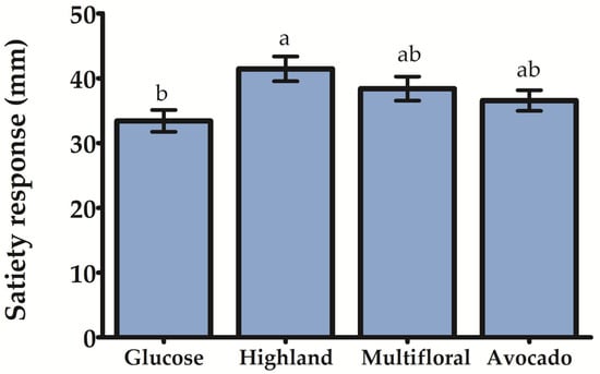 Satiety response to honey samples. The results express the mean of all satiety response values from 0 to 120 min. Different letters indicate a statistical difference, as determined via Tukey’s HSD test (α = 0.05).