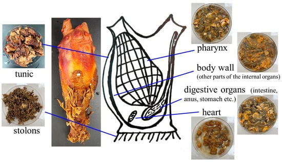 Tunicates are classified into two types based on their body structure and functional organization, and the majority of tunicates are monoecious. Solitary tunicates live independently of their tunics, while colonial tunicates live physically attached to each other’s tunics []. Colonial species brood their young larvae and release mature larvae into the water, while most others spawn eggs. Sperm undergo a period of approximately 24 h in swimming larvae, with an average larval duration of 12–24 h []. These species demonstrate swift growth rates, attaining sexual maturity within a few weeks, and possess a stationary adult form that engages in suspension feeding. Their larval stage is transient and nonfeeding []. These characteristics result in a high volume of tunicate bioresource in the sea, and finding practical and feasible applications for this new type of marine biomass is critical to both aquaculture and the environment.