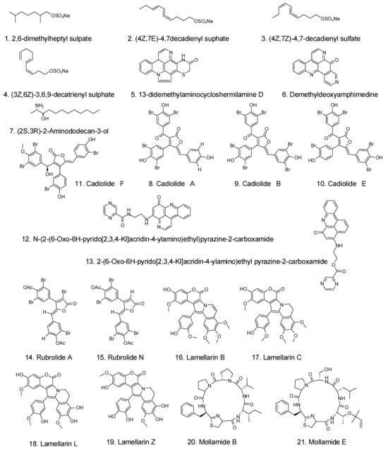 More than 1200 active molecules were identified from tunicates and tunicate-associated microbial species (Table 4) [], confirming that they are abundant in various biologically active compounds []. For example, toxins [], sphiningomyelins [], and antimicrobial tunichromes [] have been successfully extracted from different tunicate species. Lopez-Legentil et al. described two specific chemotypes in tunicate species. The pyridoacridines shermilamine B and kuanoniamine D were detected in the tunic, while their deacetylated forms were observed in the zooids. C9-unsubstituted pyrridoacridine ascidide was isolated from the purple morph of Cystodytes dellechiajei [].