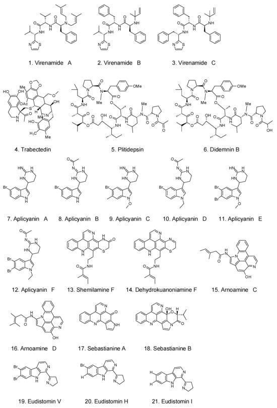 Trabectedin, ET-743, an alkaloid discovered in the orange tunicate Ecteinascidia turbinate, was the first anticancer drug approved in 2015 by the FDA for the treatment of soft tissue sarcoma in the United States []. Trabectedin originated from an E. turbinata symbiotic bacteria, Candidatus Endoecteinascidia frumentensis, and shows excellent activity in killing cancer cells in soft tissue, breast, and ovarian organs. The DNA minor groove is bound by trabectedin, which also causes DNA cleavage and alters the tumor microenvironment. Trabectedin prevents tumor cells from neoangiogenesis and metastasis, which are crucial in the treatment of cancer [].