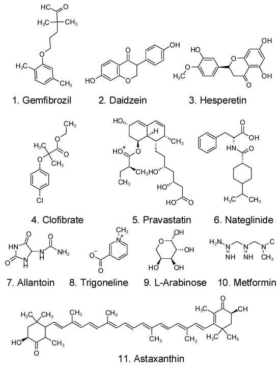 Zhu et al. examined the metabolome of Halocynthia roretzi tissue by using UHPLC–MS-MS, discovering 11 active compounds that contribute to the metabolism of lipids and blood glucose, as shown in Figure 5 []. Some molecules share structural similarities with pharmaceuticals now on the market, including metformin and gemfibrozil (two well-known medications used to treat type 2 diabetes mellitus and dyslipidemia, respectively) [].