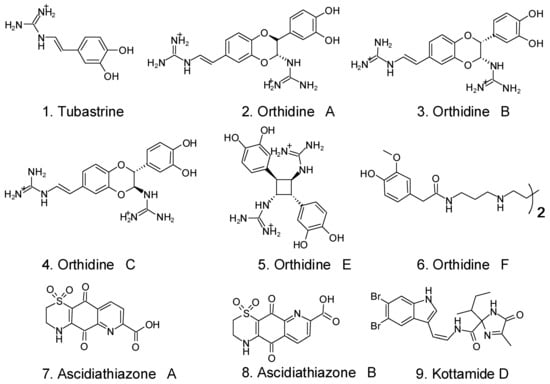 - Pearce, A.N.; Chia, E.W.; Berridge, M.V.; Maas, E.W.; Page, M.J.; Harper, J.L.; Webb, V.L.; Copp, B.R. Orthidines A–E, tubastrine, 3,4-dimethoxyphenethyl-β-guanidine, and 1,14-sperminedihomovanillamide: Potential anti-inflammatory alkaloids isolated from the New Zealand ascidian Aplidium orthium that act as inhibitors of neutrophil respiratory burst. Tetrahedron 2008, 64, 5748–5755. [Google Scholar] [CrossRef]