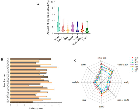 Sensory and statistical analysis results ((A), addition amount results of soy sauce in different kinds of dishes; (B), average ranking sum results of consumers’ preference of 32 soy sauces; (C), quantitative descriptive analysis results of seven kinds of soy sauce samples).