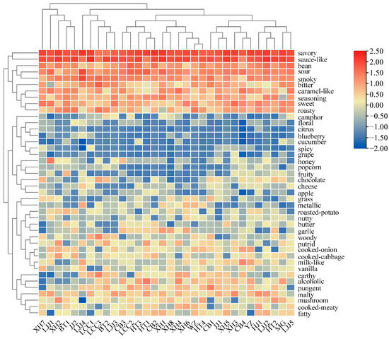 A total of 42 aroma attributes (Figure 2), including savory, sauce-like aroma, milk-like, caramel-like, cheesy, buttery, cooked meat-like, fatty, roasty, smoky, garlicky, cooked onion-like, seasoning-like, etc., from the 32 kinds of soy sauce samples were perceived by the panelists during the CATA analysis. Among them, savory, sauce-like aroma, sour, smoky, and bean aroma showed the highest frequency in all soy sauce samples, whereas the fruity attributes such as cucumber, citrus, blueberry, grape, floral, etc., showed lower frequencies. Based on the aroma profile properties, the thirty-two soy sauce samples were divided into six categories: Category 1: the HJ, LJJ2, HT2, MG, and LJJ5 soy sauces; Category 2: the CB1, JJ1, XH5, XH3, CB4, and YZ soy sauces; Category 3: the XH1, XH8, WZ, HT4, XH4, and XH6 soy sauces; Category 4: the CB3, LCC2, HT3, HT1, and CB2 soy sauces; Category 5: the LJJ4, LCC1, LCC3, BT2, and LJJ3 soy sauces; and Category 6: the LJJ1, XH2, BT1, XH7, and JJ2 soy sauces. Among all soy sauce samples, the savory, sauce-like aroma, sour, smoky, and bean aroma had higher frequencies and greater correlation coefficients than the other soy sauce aroma attributes.