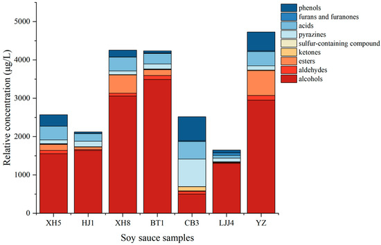 The composition and content of the main aroma compounds among seven soy sauce samples were different. The mass spectrum-based non-targeted metabonomics workflow showed that a total of 101 volatiles were detected via SPME-GC-MS (the seven total ion chromatograms are shown in Figure S1), including esters (11), ketones (17), alcohols (15), furans and furanones (15), aldehydes (10), pyrazines (13), acids (9), phenols (5), and sulfur-containing compounds (6). Among them, 38 aromatic-active compounds were identified via GC-MS/O (Table 1), including five acids, two aldehydes, four furans and furanones, five alcohols, three phenols, six pyrazines, four sulfur-containing compounds, six ketones, and one other compound. It was found that seven kinds of soy sauce contained 25 common aromatic compounds. The content of the total volatile concentrations in each type of aroma compound is shown in Figure 3.