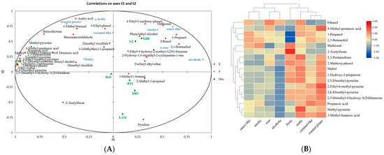 Results of PLSR analysis of aroma compounds and aroma attributes of seven soy sauces. ((A): The correlation matrix of the aroma-active compounds to sensory attributes. The red plots represent the 37 aroma-active compounds. The green plots represent the 7 soy sauce samples. The blue circles represent the 8 aroma attributes. (B): Heat map of the standard correlation coefficients of the aroma-active compounds to the aroma profiles.).