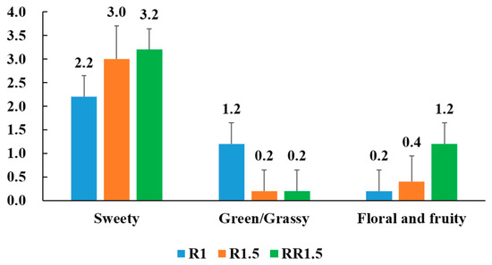 As shown in Figure 2, the scent profiles of the three black teas were largely different. The intensity of the sweet scent in R1.5 (3.0) and RR1.5 (3.2) was stronger than that in R1 (2.2). Additionally, R1 (1.2) had a slight green scent, which was slightly presented in R1.5 (0.2) and RR1.5 (0.2). An obvious floral and fruity scent was exclusively released by RR1.5 (1.2). In our previous study, it was found that tea leaves presented obvious floral and fruity scents after fermenting for 1–3 h, which gradually decreased along with the extension of fermentation [8]. In this study, the fermentation time was 5 h. At this point, the floral and fruity scents had disappeared in fermented tea leaves, thus showing that R1 and R1.5 black tea possess less floral and fruity scents. Unlike R1 and R1.5, RR1.5 black tea undergoes re-rolling treatment during the middle of the fermenting period. After re-rolling, the biochemical conditions in tea leaves are remodeled and thus create a novel occasion for generating floral and fruity scents in the later fermenting period. Actually, obvious floral and fruity scents were smelled in the RR1.5 fermenting tea leaves during the latter fermenting period. This is maybe the reason for RR1.5 black tea presenting obvious floral and fruity scents.