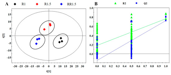 PLS-DA was used to analyze the overall aroma difference of the three black teas based on above 179 volatile components. As shown in Figure 4A, the tea samples were clearly separated into three regions, indicating that there were obvious differences in aroma among R1, R1.5, and RR1.5 and that re-rolling treatment significantly altered the aroma components of black tea. The cross-validation analysis of the above PLS-DA model showed that this model was reliable (Figure 4B, R2 = 0.183, Q2 = −0.142).