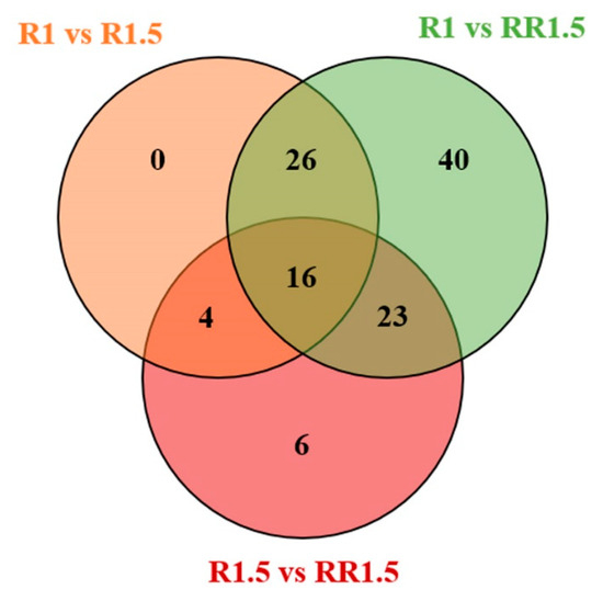 Differential volatile compounds between any two tea samples were screened via ANOVA (p < 0.05). There were 46, 105, and 48 differential volatile compounds in the R1 vs. R1.5, R1 vs. RR1.5, and R1.5 vs. RR1.5 groups, respectively; and among them, 16 volatile compounds showed statistical differences in all three comparison groups (Figure 5 and Tables S2–S4). For these differential volatile compounds, 35, 80, and 32 volatile compounds were significantly increased, and 11, 25, and 16 volatile compounds showed reverse changes in the R1 vs. R1.5, R1 vs. RR1.5, and R1.5 vs. RR1.5 groups, respectively (Tables S2–S4). During the fermentation period, volatile compounds were derived from the degradation of fatty acids, amino acids, carotenoids, and GBVs [7,20], which were triggered by the rolling step [21,22]. It was reported that biochemistry reactions during the fermentation period were greatly accelerated with the extension of rolling time [22]. The rolling time of R1.5 and RR1.5 was longer than that of R1, which improved the degradation of aroma precursors and thus increased the concentrations of volatile compounds in R1.5 and RR1.5 black teas. This explains why the numbers of increased volatile compounds were higher than that decreased volatile compounds in the R1 vs. R1.5 and R1 vs. RR1.5 groups.