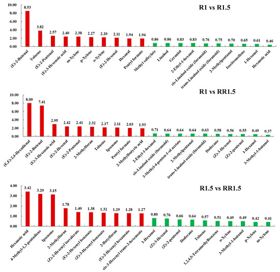 To better investigate the differences in volatile compounds among the R1, R1.5, and RR1.5 black teas, we screened and compared the top differential compounds (TDCs) with high fold changes (FCs). Compared with R1, the up-regulated TDCs in R1.5 were mainly aldehydes and aromatic hydrocarbons, including (E)-2-butenal, toluene, (E)-2-pentenal, (E)-3-hexenoic acid, m-xylene, and (E)-2-hexenal amongst others, while the down-regulated TDCs were mainly alcohols and other compounds, including hexanoic acid, 1-hexanol, isocitronellene, 2-methylpentanal, trans-linalool oxide (furanoid), and cis-linalool oxide (furanoid) amongst others (Figure 6). Compared with R1, the up-regulated TDCs in RR1.5 were also mainly aldehydes, including (E,E)-2,4-hexadienal, (E)-2-butenal, (E)-3-hexenoic acid, (E)-2-hexenal, (E)-2-pentenal, ipsenone, and α-ionone amongst others, while the down-regulated TDCs were mainly alcohols, including 3-methyl-1-butanol, 1-hexanol, (Z)-2-pentenol, (Z)-3-hexenol, dodecane, and trans-linalool oxide (furanoid) amongst others (Figure 6). It is worth noting that the FCs of increased TDCs were higher than those of decreased TDCs in the above comparison groups. This indicated that R1.5 and RR1.5 had a higher aroma intensity compared with R1. Compared with R1.5, the up-regulated TDCs in RR1.5 were mainly esters, ketones, and aldehydes, such as hexanoic acid, 4-methyl-1,3-pentadiene, ipsenone, (Z)-2-hexenyl isovalerate, (E)-2-hexenyl benzoate, and (Z)-3-hexenyl benzoate amongst others, while the down-regulated TDCs were aromatic hydrocarbons and alcohols, including m-xylene, p-xylene, 3-methyl-1-butanol, (Z)-2-pentenol, and 1-hexanol amongst others (Figure 6).