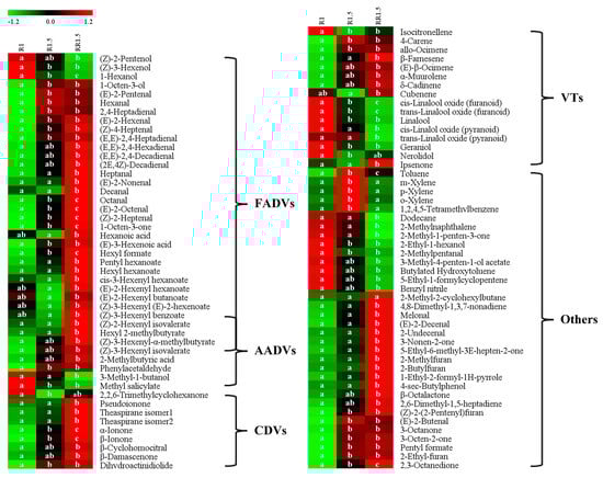 Figure 7. Heat-map of the levels of differential nonvolatile compounds. FADVs: fatty acid-derived volatiles; AADVs: amino acid-derived volatiles; CDVs: carotenoid-derived volatiles; VTs: volatile terpenoids. The data were UV-scaled. a, b, c: p < 0.05 for the changes with different letters (Tukey s-b (K) test).