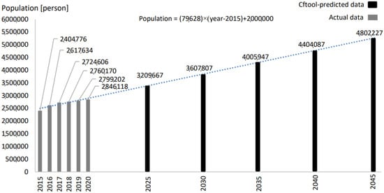 As shown in Table 1, the food demands for all categories have increased from 2015 to 2020. The compound annual growth rate of food demand is the highest for the fruits category, followed by the egg, meat, dairy products, vegetables, fish, and cereals categories, respectively. The overall increasing trend of the food demand is directly attributed to the increase in the population in Qatar, which increased from 2,437,790 persons in 2015 to 2,846,118 in 2020 (i.e., increased by 14.3%) [] (Figure 1). Figure 1 shows the actual population from 2015 to 2020. In addition, utilizing the raw data of Qatar population (Table 1) provided by the Planning and Statistics Authority of Qatar from 2015 to 2020 [], a linear correlation has been driven using the curve-fitting tool “Cftool”, available in MATLAB [] to extrapolate the future population (Figure 1). The projected data generated by Cftool are based on the assumption that population growth will continue to increase at the same rate.