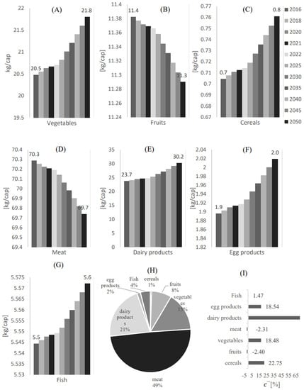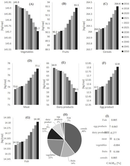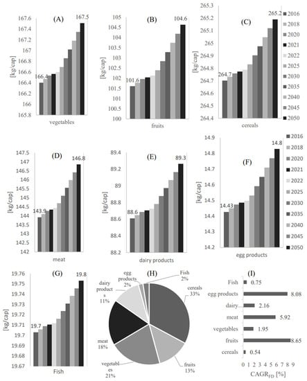The food demand per capita profile from 2016 to 2050 in Qatar for (A) Vegetables, (B) Fruits, (C) Cereals, (D) Meat, (E) Dairy products, (F) Egg products, and (G) Fruit. (H) The demand percentage [Mass %] for each food category with respect to the overall food demand. (I) The food demand compound annual growth rate.