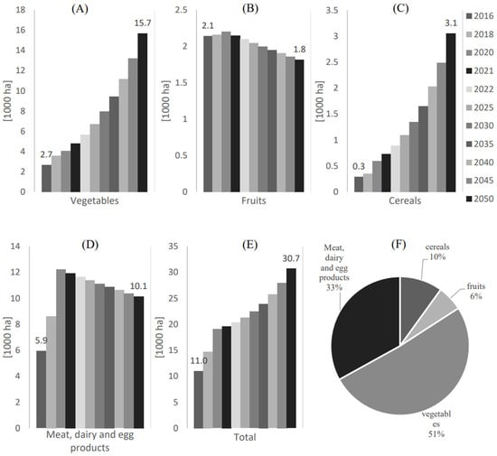 The corresponding areas used for local food supply are shown in Figure 4. As shown in Figure 4A, the largest area is reserved for producing vegetables, with an estimated area increase from 2.7 [1000 ha] to 15.7 [1000 ha] from 2016 to 2050, respectively. This is followed by the area designated for producing meat, dairy, and egg products, estimated to be 10.1 [1000 ha] in 2050.