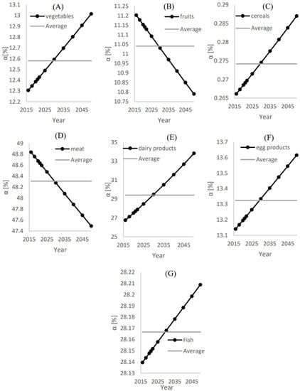 ) and () for (A) Vegetables, (B) Fruits, (C) Cereals, (D) Meat, (E) Dairy products, (F) Egg products and (G) Fish.