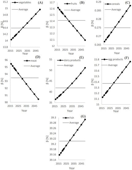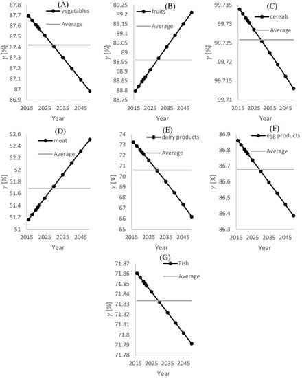 Figure 6 shows the annual and average ratios of the local food supply to the total demand () and () for (A) Vegetables, (B) Fruits, (C) Cereals, (D) Meat, (E) Dairy products (F), Egg products, and (G) Fruit. The highest average ratio of the local food supply to the total demand () was found for the meat category, which is estimated to be 48.3%. This means that the local production of meat can fulfill 48.3%, as shown in Figure 6D. Although the annual ratio of the local food supply to the total demand () is reduced with time, the reduction rate is insignificant.