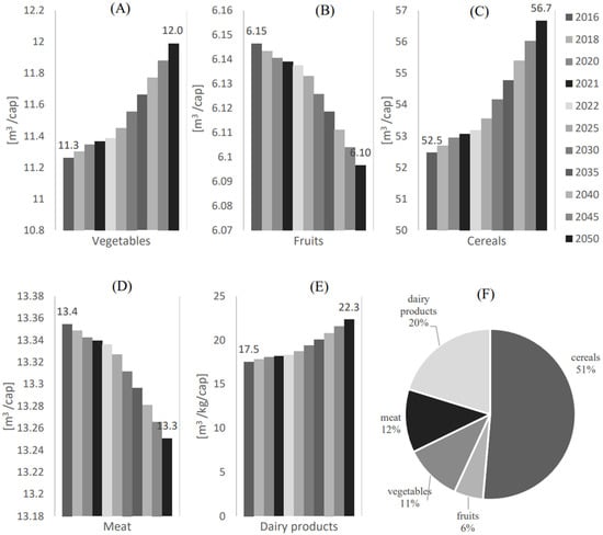 Water consumption () per capita [] for the local food supply of (A) Vegetables, (B) Fruits, (C) Cereals, (D) Meat, and (E) Dairy products. (F) Water consumption share () for each food category.