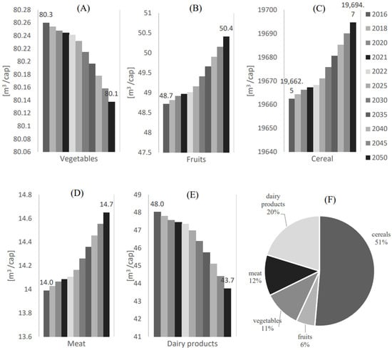 Figure 10 shows water consumption () per capita [] for the additional local food supply to achieve food self-sustainability ( for (A) Vegetables, (B) Fruits, (C) Cereals, (D) Meat, and (E) Dairy products. (F) shows the water consumption share () for each food category. For the meat category, Figure 10D suggests that fulfilling the water demand to achieve the food self-sustainability of this category is expected an estimated water consumption of 14.7 m3/cap in 2050. Another potential for achieving food self-sustainability is found for dairy products and fruits, with an estimated water consumption for the additional local food supplies of 43.7 m3/cap and 50.4 m3/cap in 2050, respectively.