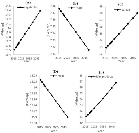 As the energy quantifications correspond to the water consumption shown in Figure 9 and Figure 10, energy trends follow the same water consumption patterns. However, the energy quantification can be obtained in Figure 11 and Figure 12. Figure 11 shows that the corresponding energies of the treated water to be used in irrigation for the local supply of vegetables, fruits, cereals, meat, and dairy products are 14.38 kW/cap, 7.31 kW/cap, 68 kW/cap, 16.1 kW/cap, and 26.81 kW/cap in 2050, respectively.