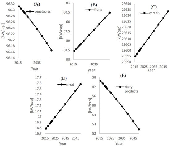 Figure 12 shows that the corresponding energies of the treated water to be used in irrigation for the additional supply to achieve food self-sustainability ( of vegetables, fruits, cereals, meat, and dairy products are 96.16 kW/cap, 60.5 kW/cap, 23.633 MW/cap, 17.58 kW/cap, and 52.45 kW/cap, respectively.