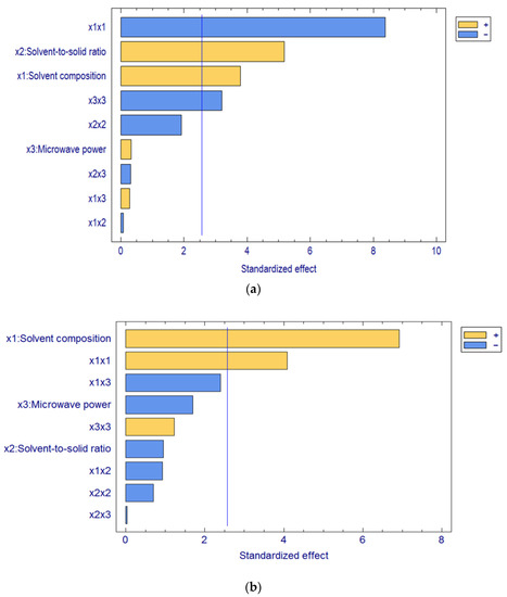 p-value lower than 0.05 are represented by bars crossing the vertical line in the Pareto chart. Hence, the most influencing factor was the solvent composition (