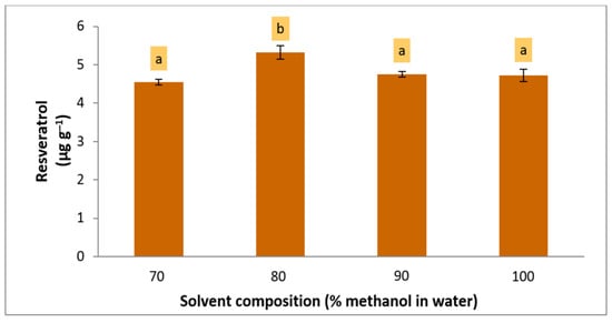 20]. Furthermore, a mixture of methanol–water is proven to efficiently extract the resveratrol from several food matrices [